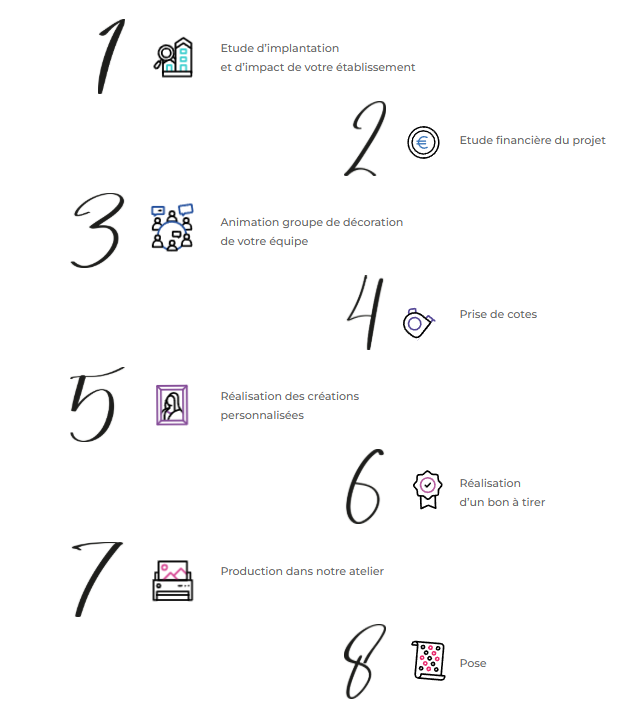 Nous établissons un budget clair et détaillé, intégrant l’étude du projet, le design des illustrations, la production et la pose. Cette approche transparente vous permet de maîtriser votre investissement tout en bénéficiant d’un rendu haut de gamme.