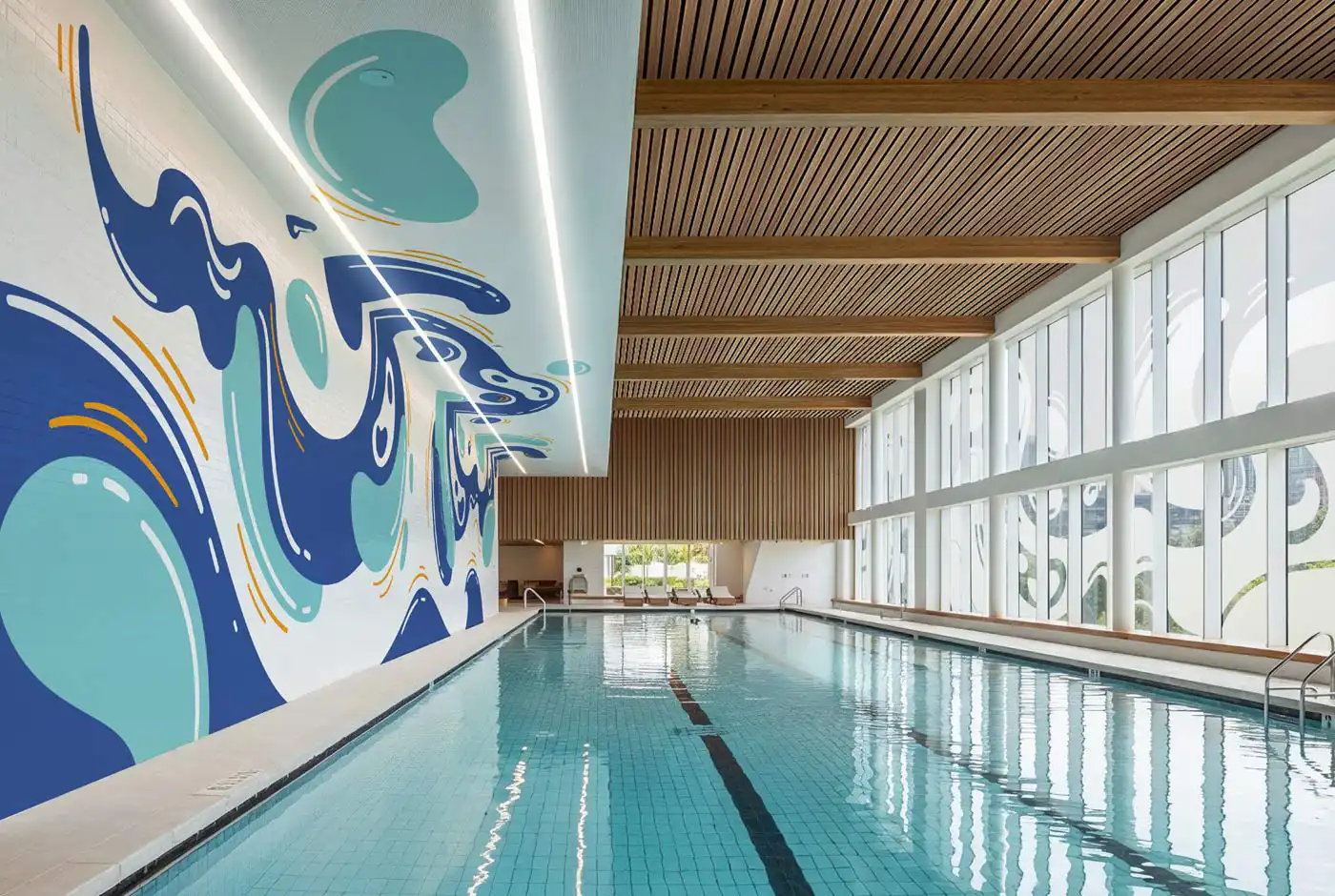 Des formes ondulantes dans des tons bleu turquoise et sable, un effet aquarelle pour habiller les parois vitrées et guider les usagers vers les vestiaires. L’ambiance devient immédiatement plus douce, accueillante et cohérente avec l’activité du lieu.