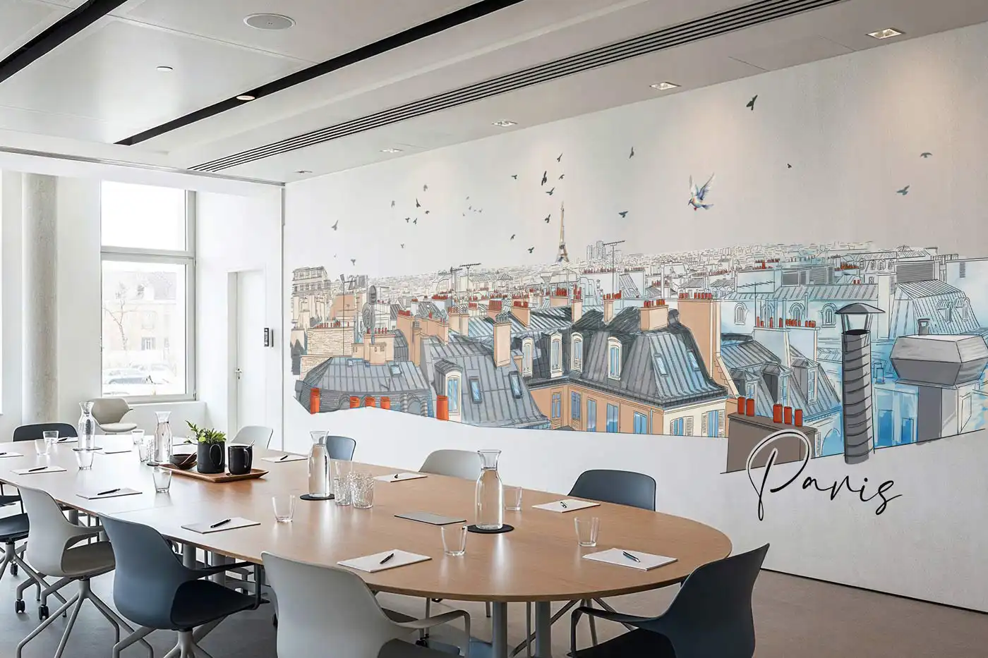 Du hall d’accueil d’une mairie à la salle d’un conseil départemental, les fresques, adhésifs grands formats, trompe l’œil ou vitrophanies transforment des lieux souvent neutres en espaces chaleureux, identitaires et fonctionnels.